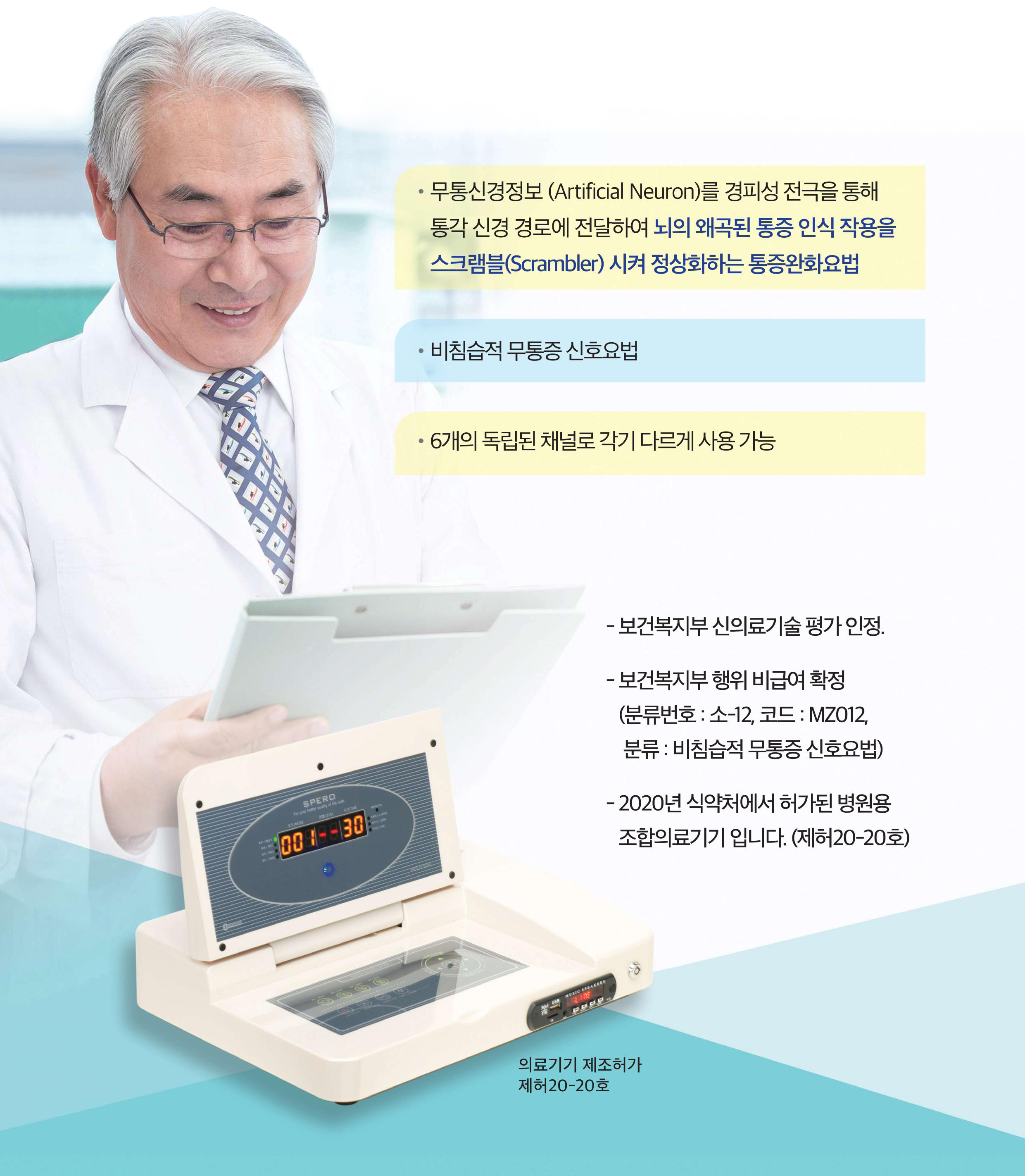 만성 통증, 난치성 통증, 수술 후 또는 외상 후 일반통증, 신경병증 통증완화를 목적으로 전극패드를 통하여 인체에 전기적 자극신호를 가하는 기구 만성 · 난치성 통증 치료 기기
