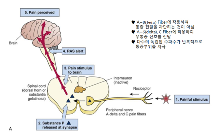 기기에서 나온 전기자극신호를 “통증 교란신호”로 작용하여 통증의 정보를 교란, 교란된 정보를 뇌신경체제에 전달되도록 유도함으로써 통증을 완화시킨다.